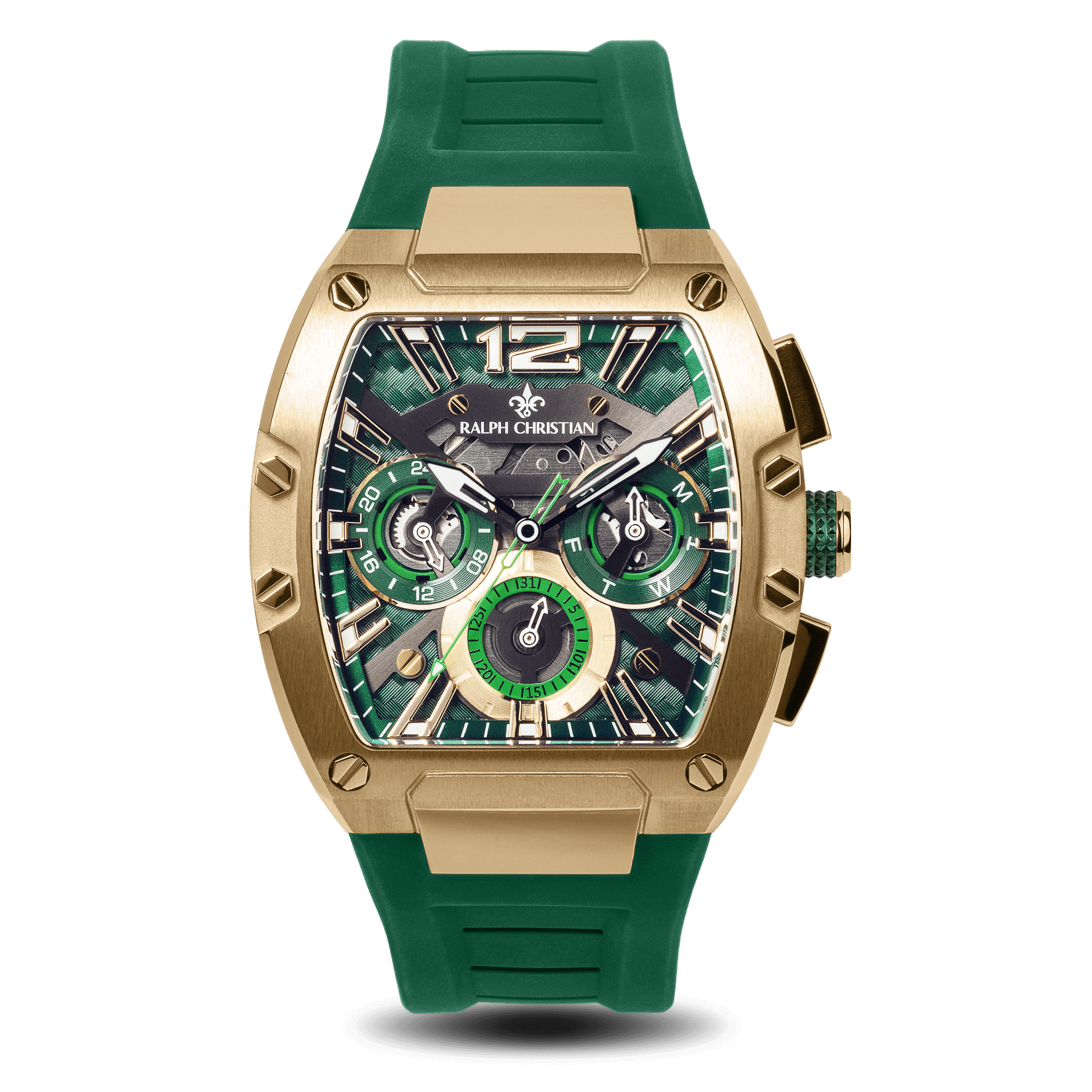 | Dial Feature: | DIAL | Part Skeletonized, Multi Layered Gold & Accent Green |