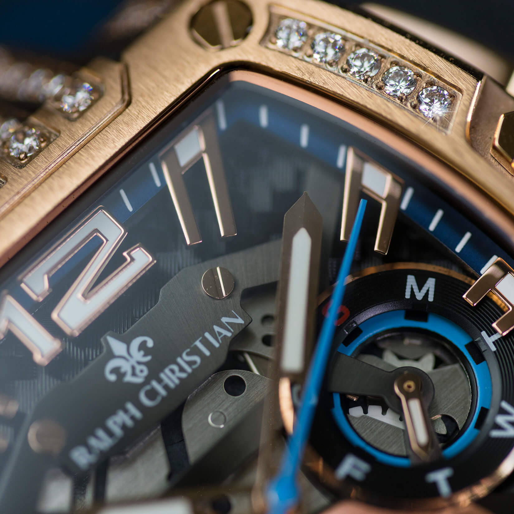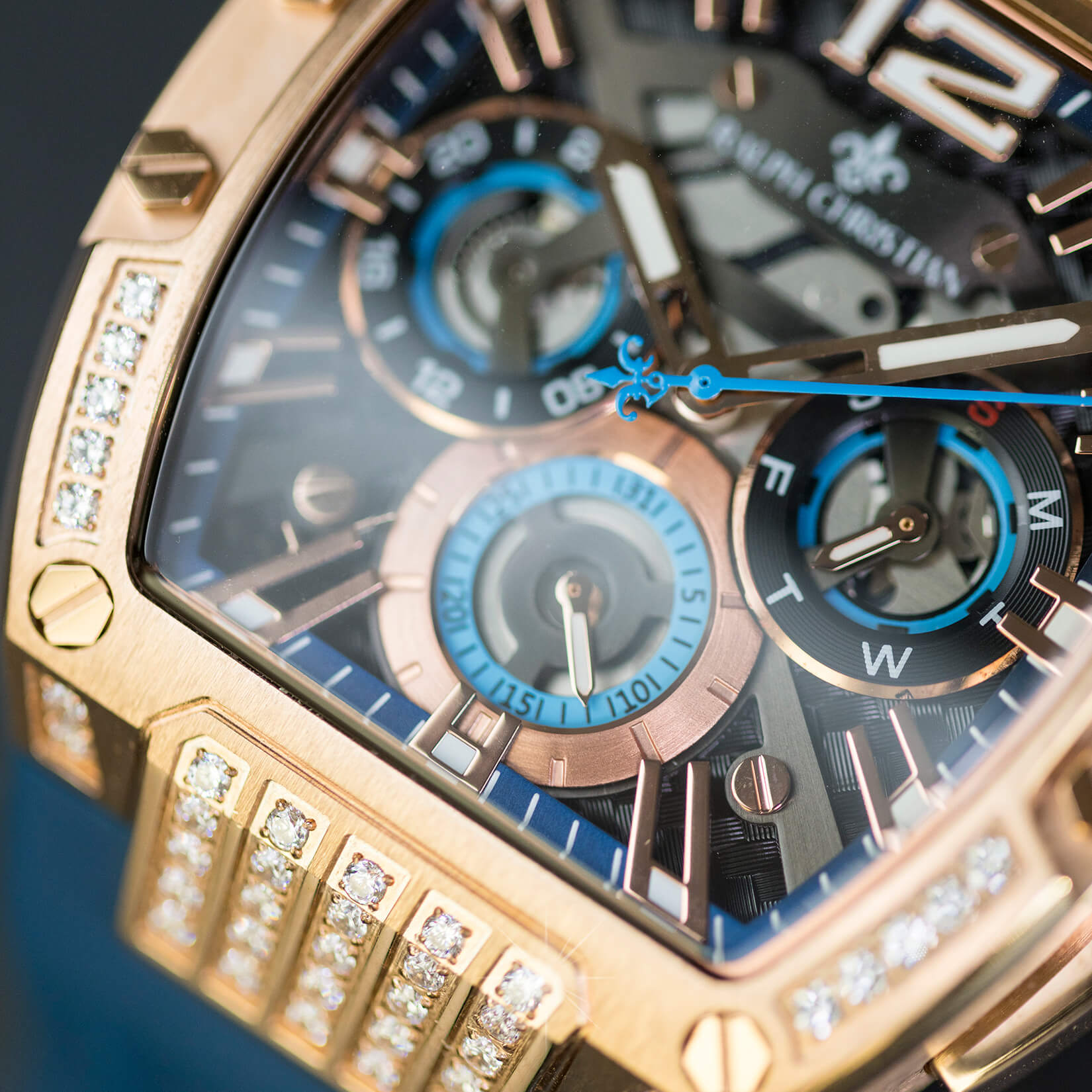 | Dial Feature: | DIAL | Part Skeletonized, Multi Layered Rose Gold & Blue |